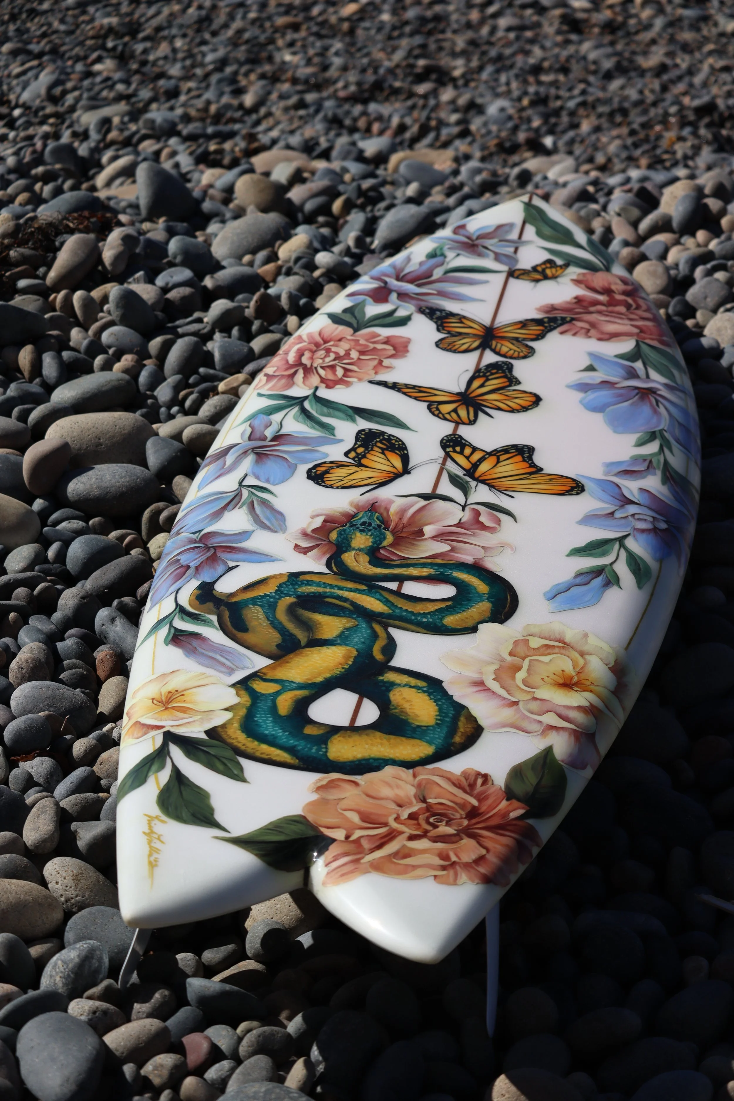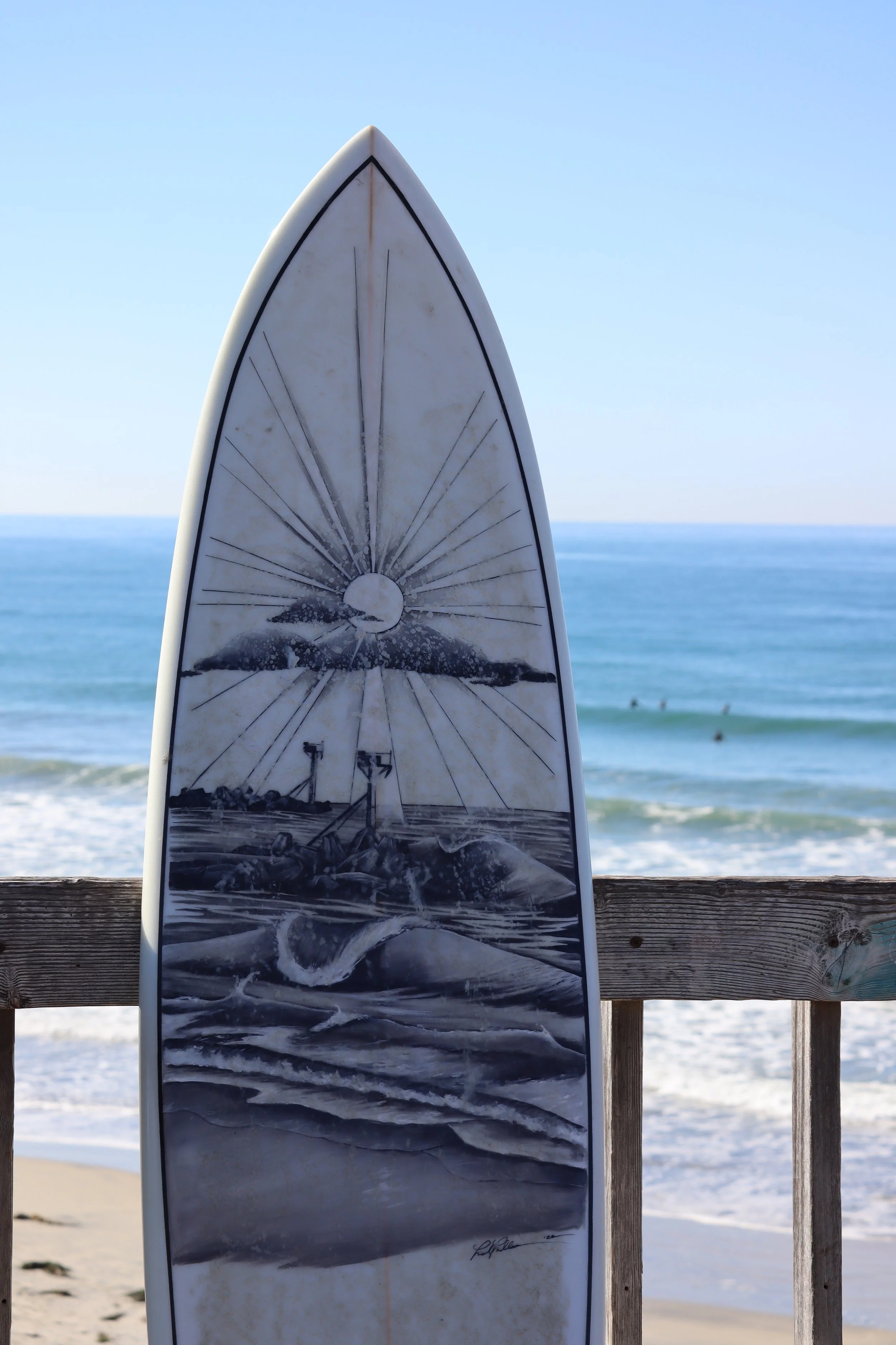 These projects will take many weeks to complete once I have found and purchased a board to upcycle if necessary. When working with a shaper, this will add some time as well. With this being said, giving me ample time to create (I like to suggest 2-3 months from our initial conversation) is necessary. Depending on my commission que, it could be done faster but it is never guaranteed. If you need me to complete a rush order, there will be a fee.
